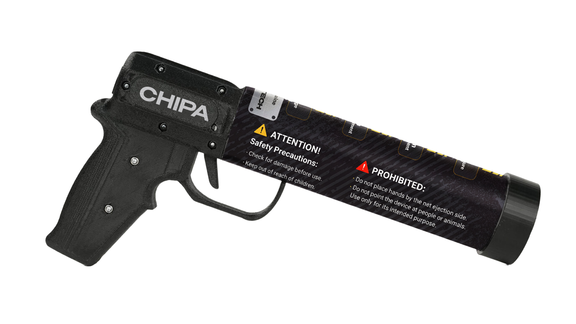 The "CHIPA" net launcher is a portable counter‑UAV device designed for the rapid neutralization of drones within line of sight. Its operating principle is based on mechanical disruption: after activation, a special net is discharged from the cartridge, which deploys in a fraction of a second and entangles the drone’s propellers, completely disabling control and preventing further flight. The system is intended for use in conditions where the deployment of electronic warfare equipment is undesirable or ineffective. Thanks to its simple design and intuitive operating procedure—removing the safety, aiming, and pulling the trigger—the device requires minimal training and is ready for immediate use in rapid-response situations.