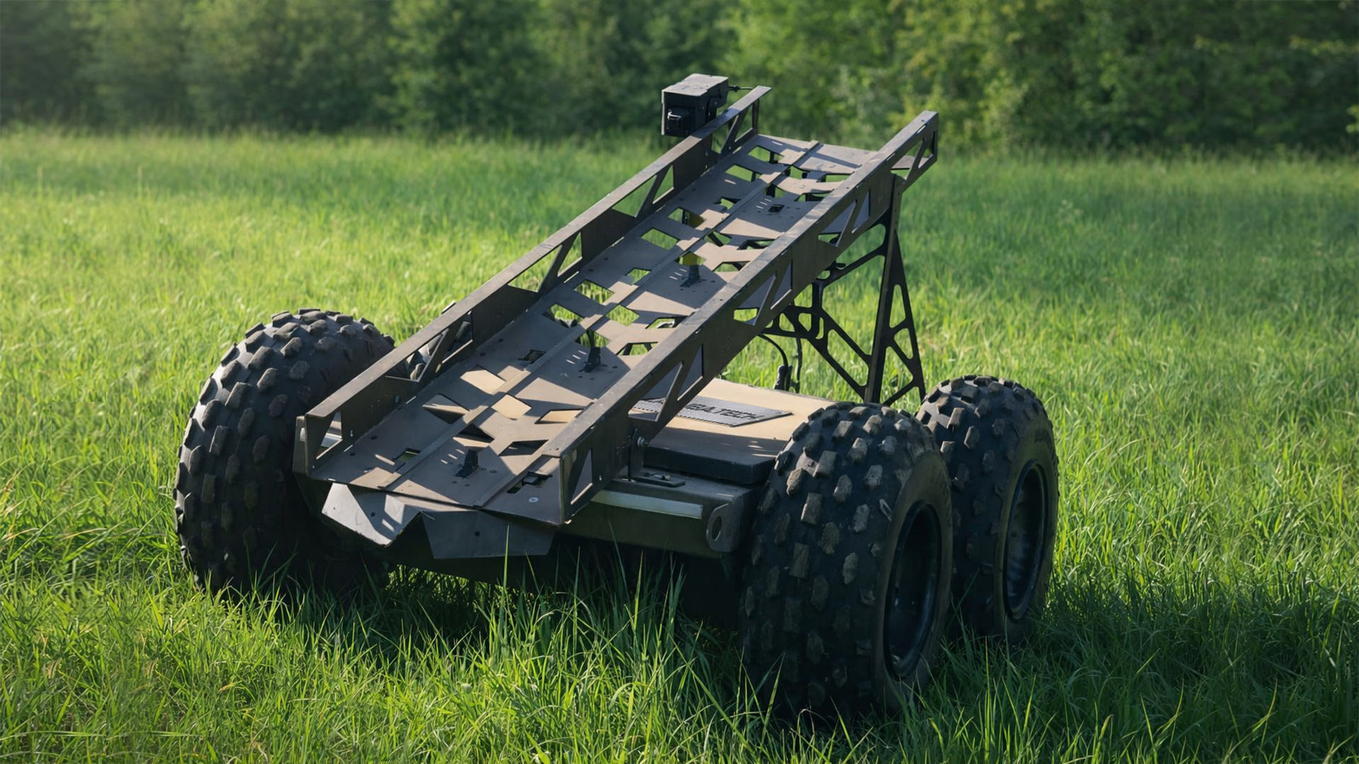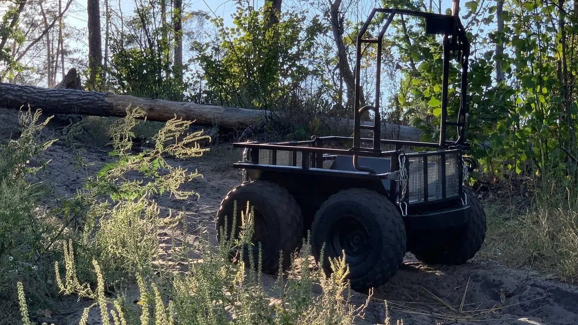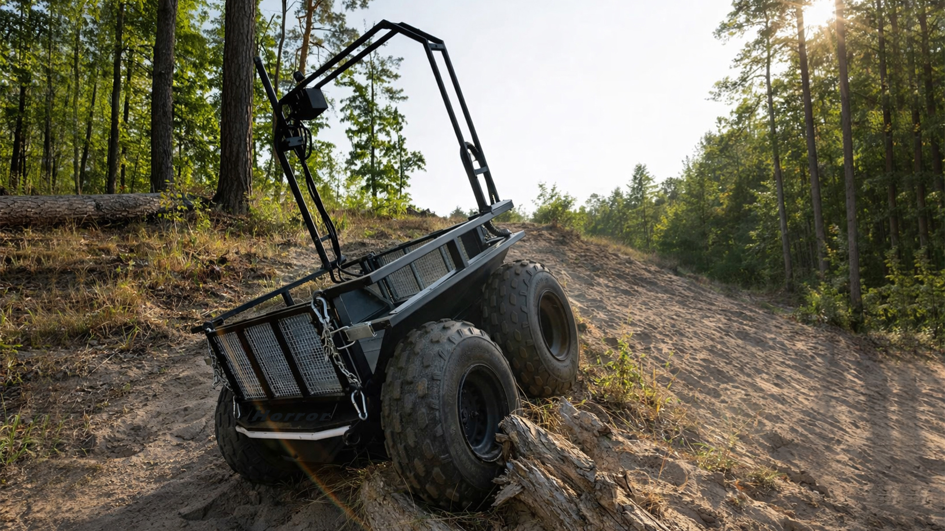 The wide tires ensure confident obstacle traversal, including climbs up to 25–30°, sand, grass, puddles, mud, logs up to 300 mm in diameter, and small obstacles.